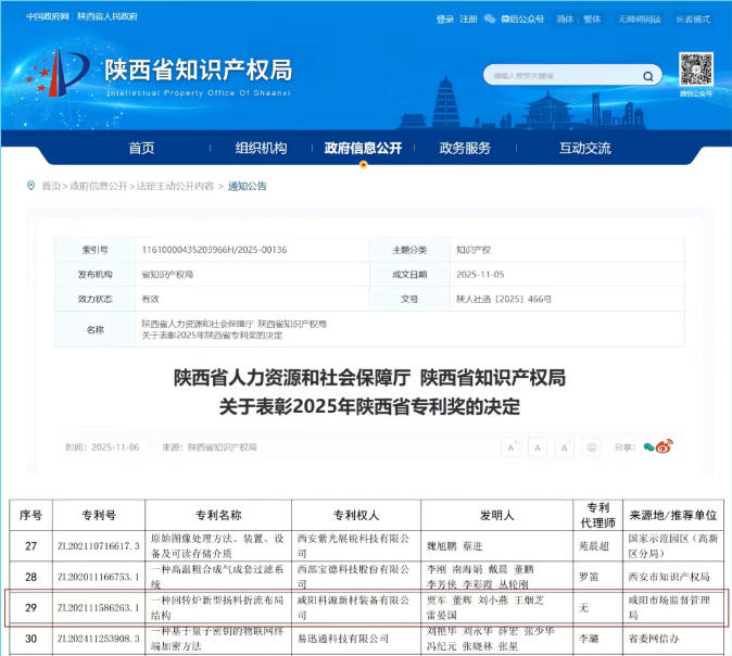 11月6日,陕西省知识产权局正式公布2025年陕西省专利奖评选结果,咸阳科源新材装备有限公司申报的发明专利——《一种常州回转炉新型扬料折流布局结构》(专利号ZL202111586263.1)摘得优秀奖!